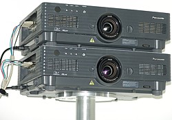2 x Panasonic PT-D5600 DLP Projektoren zum Toppreis. Bedingt durch die horizontale und vertikale Shiftbarkeit der einzelnen Projektoren ist bei diesen professionellen Projektoren ein Stackbetrieb von 2 Geräten oder auch mehr möglich. Die PT-D 5600 und 5700 verfügen über mehrere interne Testbilder mit der in wenigen Minuten 2 gleiche Bilder übereinander gebracht werden können, um wie in diesem Fall aus 2 x 5000 Ansilumen 10.000 machen zu können, und das bei einem Einzelleistungsgewicht von nur 13 kg pro Gerät.