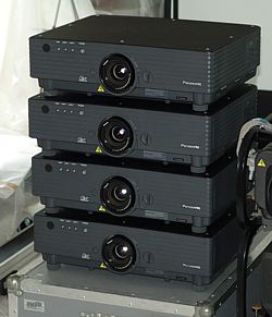 4 x Panasonic PT-D5500 DLP Projektoren zum Toppreis. Bedingt durch die horizontale und vertikale Shiftbarkeit der einzelnen Projektoren ist bei diesen professionellen Projektoren ein Stackbetrieb von 4 Geräten oder auch mehr möglich. Die Projektoren verfügen über mehrere interne Testbilder mit der in wenigen Minuten 4 gleiche Bilder übereinander gebracht werden können, um wie in diesem Fall aus 4 x 5000 Ansilumen 20.000 machen zu können, und das bei einem Einzelleistungsgewicht von nur 13 kg pro Gerät.
