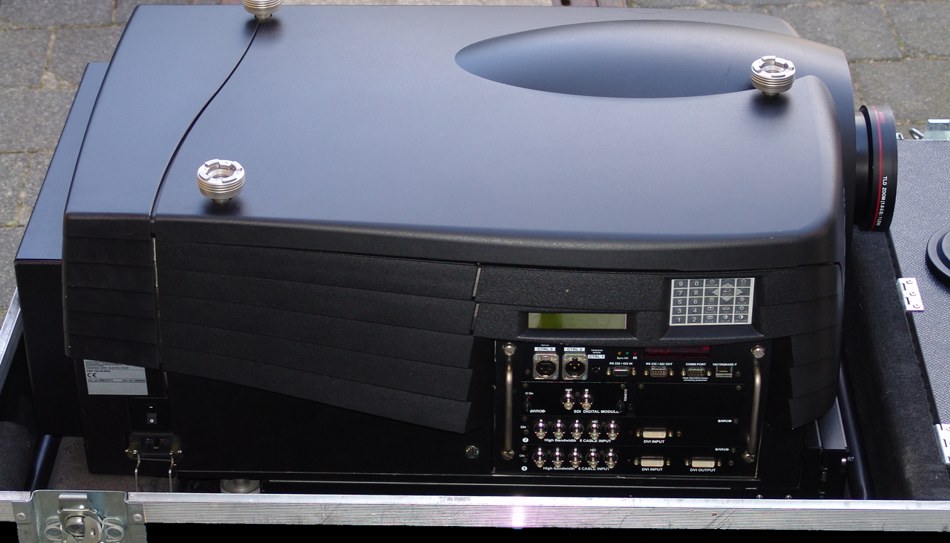 Der Projektor Barco SLM R10 ist noch weiter aufrüstbar mit HD-SDI. Anschlüsse: S-Video, 5 x BNC RGBHV, RS232, SDI in, 2 x DVI in und out SDI in