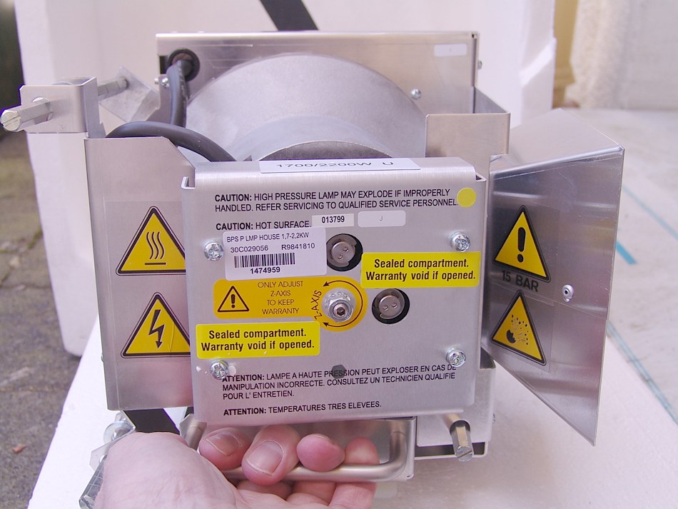 Die 3-Chip-Technologie ist vom Anschaffungspreis daher deutlich teurer als 1-Chip-Projektoren. Der hier angebotene Barco SLM R10 Projektor hatte von daher einen Anschaffungspreis von ca. 40.000 Euro. Die Lightengine ist staubgeschützt. Im Gegensatz zu normalen Projektoren, die meist nur bis nur ca. 35° Umgebungstemperatur einsetzbar sind, kann dieser Barco SLM R10 auch noch bei 40° C betrieben werden. Im Sommer bei der Übertragung von Fussballspielen usw. können ein paar Grad mehr schon sehr wichtig sein.