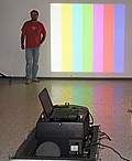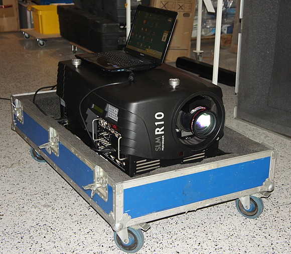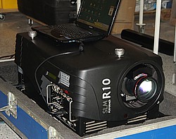 10.000 Ansi-Lumen Barco SLM R10, hochprofessioneller 3-CHIP-DLP-Projektor mit besten Farben, dank eingesetzter 2200 Watt XENON Lampe und seiner 3-CHIP-Technologie. Native Auflösung SXGA 1280x1024 Pixel. Nur Xenon-Lampen kommen dem natürlichen Tageslicht, von der Farbtemperatur her aus gesehen, am nächsten. Daher verwenden alle Kinos solche Leuchtmittel. Normale Metalldampflampen aus konventionellen Projektoren haben den großen Nachteil eines Überschusses im spektralen Grünbereich, der z.B. Hauttöne in der Bilddarstellung leicht grün eingefärbt. Die Gesichter wirken dann fahl, bzw. unnatürlich.