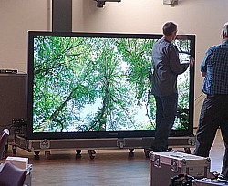 Das hier vorgestellte Plasmadisplay ist das weltweit größte und besitzt mehr als zwei Millionen Bildpunkte (1.920 x 1.080) bei einer sichtbaren Bildschirmdiagonale von 261 cm. Für diese supergroßen Panels hat Panasonic extra neue Rippen und Leuchtstoffe entwickelt. Das 103 Zoll Full HD-Plasmapanel zeichnet sich deshalb durch gleichförmige und gleichbleibende Entladungsvorgänge aus. Diese sorgen dafür, dass Bildschärfe und Helligkeit von der Mitte bis in alle Ecken des Bildschirms den Werten des 50 Zoll HD-Modells (TH-50PX600) entsprechen, das mit dem EISA-Award ausgezeichnet worden ist.