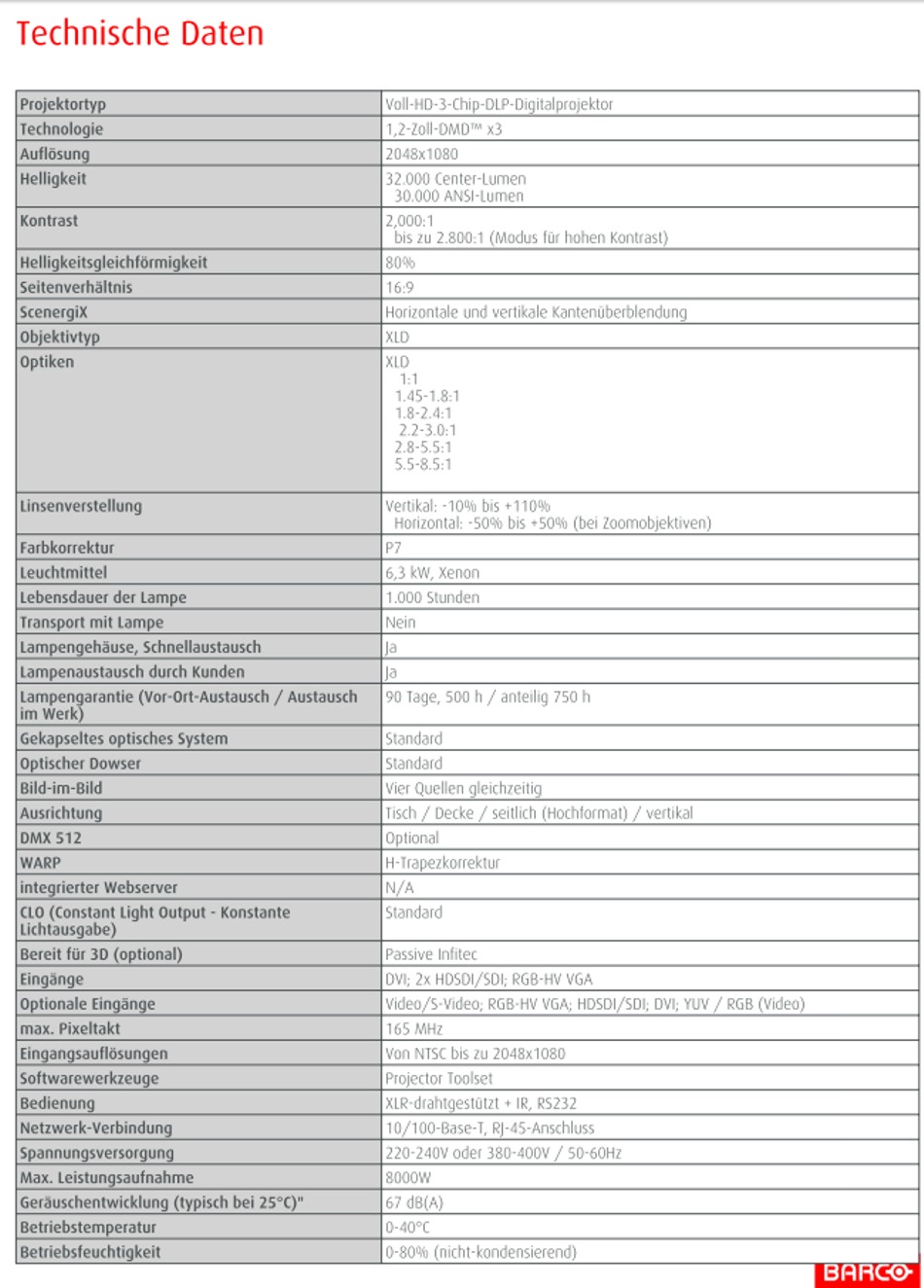 | Projektionssystem | 3 x DC2K DLP Chip | | Ansi-Lumen | 30000 | | Kontrast | 1600:1 full on/off | | Schwarzwert | 18.75 min. Lumen | | Lensshift | Vert.: +55% -5% Hori.: +/-25% | | Auflösung | HD2K 2048 x 1080 | | Videosignale | Pal, Pal-M, Pal-N, Pal-60, SECAM, NTSC, HDTV 720p, 1080i, EDTV 480p, 576p | | Focus | motorisch | | Zoom | motorisch | | Objektiv | optional | | Projektionsverhältnis | optional | | Audio | nein | | Anschlüsse | 1x DVI , 1x SDI, 1x HD-SDI, 1x D-sup 15 pin in 1 x out,1x RS-232C IN (D-9 connector) , 1x RS-232C OUT (D-9 connector), 1x RS-232C IN (XLR connector),2 x RJ45,Optional: 1x composite video/S-Video, 1x | | Deckenmontage | ja | | Stromverbrauch | 8400W | | Maße BxHxT | 810 x 631 x 1563 mm (31,9"x24,8"x61,5") 798.86 L/dm³ | | Betriebsgeräusch | | | Gewicht | 180 kg / 396,83 lbs. | | Foot-Lamberts | 125 fL / max. 1760 cm Bildbreite | | Besonderheiten | Lens shift Funktion, Lan Netzwerk kompatibel. |