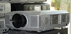 Sanyo PLC- XF 45. Diese Geräte sind die am meisten eingesetzten Projektoren in dieser Leistungs- und Gewichtsklasse. Betriebskosten sind bei diesem Gerät sehr günstig, Ersatzleuchtmittel sind bereits ab ca. 129 €/Stk netto zzgl. MwSt. erhältlich. Mit nur ca. 36 Kg sind diese XF45 auch relativ leicht. Im Gerät sind 4 Leuchtmittel verbaut mit einer Gesamtleistung von 1000 Watt (4 x 250 Watt). Sollte ein Leuchtmittel ausfallen, (was nach unserer Erfahrung allerdings eher selten vorkommt) kann die Veranstaltung mit etwas verringerter Lichtleistung weiterlaufen. Durch den sehr hohen Verbreitungsgrad der Maschinen im Mietparkbetrieb sind optionale Optiken gut und preiswert fast überall anmietbar.