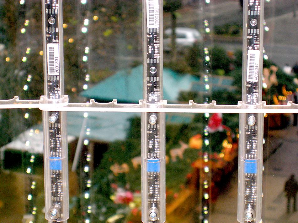 | 8 cm Abstand von LED zu LED Tube |  | In diesem Fall ca. 16 Meter breite Anwendung |  | Maximaler Stromverbrauch ca. 37 W/lfm LED Tube |  | Inhalt kann aus der "Ferne" mittels Interntfähigen PC eingespielt werden. Ebenso kann die ganze LED Wand aus der Ferne gesteuert werden. Siehe Fotos |  | Preis pro qm ab 1.550,00 EU/qm |