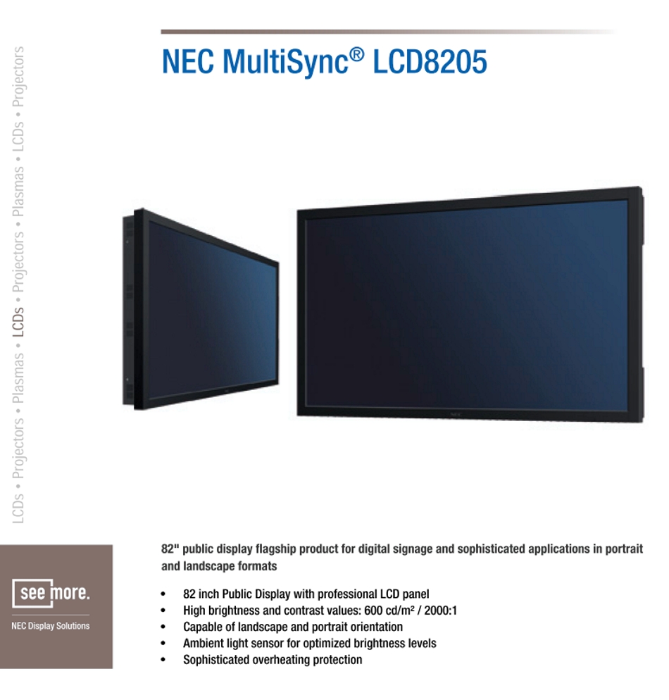 Für brillante Farben und real wirkende Bilder in beeindruckender Größe bringt NEC Display Solutions den NEC MultiSync ® LCD8205 auf den Markt. Das neue Professional Display in 82-Zoll bietet Full HD-Auflösung bei einer maximalen Helligkeit von 600 cd/m 2 . Das neue Public Display ist damit ideal um im Bereich Digital Signage, speziell am Point of Sale, die Aufmerksamkeit auf sich und die dargestellten Inhalte zu ziehen – egal ob in Landscape oder Portrait. Weitere Einsatzbereiche für das 82-Zoll Public Display finden sich im Transportwesen, als Corporate Bulletin Board in Empfangsbereichen oder als Präsentationsdisplay in großen Konferenzräumen. Dank eines integrierten Lichtsensors passt sich das Display an die jeweiligen Lichtverhältnisse an. Für die unterschiedlichsten Einsatzmöglichkeiten bietet es zudem eine Vielzahl an Schnittstellen sowie HDMI. Das Digital Interface (SPDIF) für digitale Audiosignale sorgt für zusätzliche Flexibilität. Der NEC MultiSync ® LCD8205 verfügt außerdem über einen innovativen Überhitzungsschutz, der kontinuierlichen sowie zuverlässigen Betrieb gewährleistet.