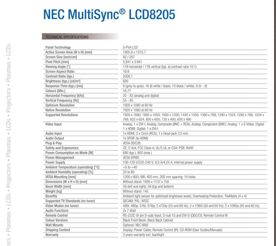 Hohe Flexibilität im Einsatz bietet der NEC MultiSyn c ® LCD8205 auch dank Videoeingängen wie Component, Composite und S-Video. Ebenfalls in der Ausstattung enthalten sind ein digitaler DVI-D Anschluss sowie HDMI und RS232-Kontrolle. Besondere Zukunftssicherheit garantiert zudem die Schnittstelle SPDIF für die Abnahme digitaler Audiosignale, die über den HDMI Anschluss des Displays eingespeist werden.