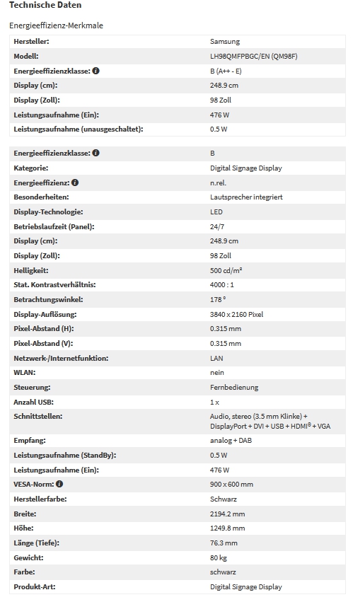 98 Zoll Samsung QM98F 249 cm Bilddiagonale, 4k, hell 500cd/qm, Einzelstück zum Sonderpreis