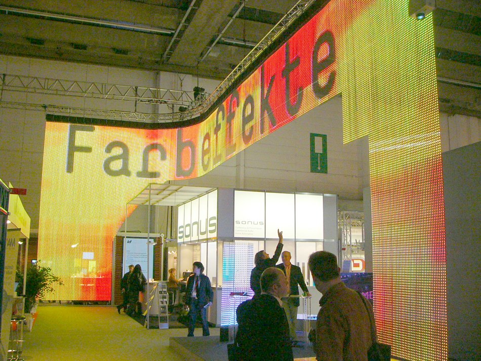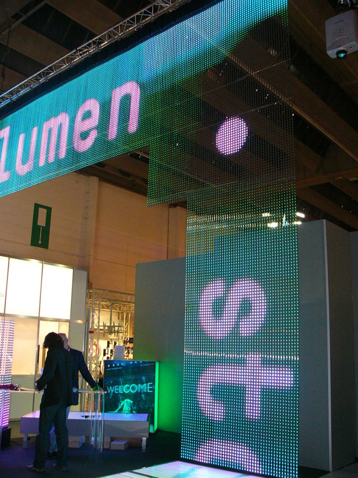 | Das mit Abstand flexibelste LED System auf dem Markt. In Deutschland entwickelt und produziert |  | Daylight System. Gleissend hell, tageslichttauglich |  | Doppelseitig nutzbar, d.h. die Rückseite des Systems ist ebenfalls als leuchtend bestellbar |  | Schnellste Montage, Minimales Transportvolumen |  | Frei formatierbares, steckbares System |  | Höhe von 96,5 cm bis 7,7 Meter in 8 Strängen steckbar. |  | Leistung pro Strang maximal 300 Watt |  | 32 Bit Farben, maximale Auflösung 1024 x 768 Pixel |  | Betriebstemperatur von 0-65°, B1Ansteuerbar per Glasfaser bis 15 Km. |  | Beispiel: Curved screen Grösse 5040 x 2,880 mm |