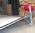 Fast Fold Bildwand. Aufbau in ca. 30 Minuten mit 2 Personen möglich. Die Bildwandfläche wird Gummispannern gespannt.