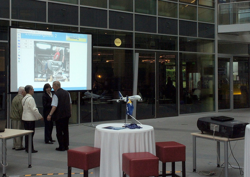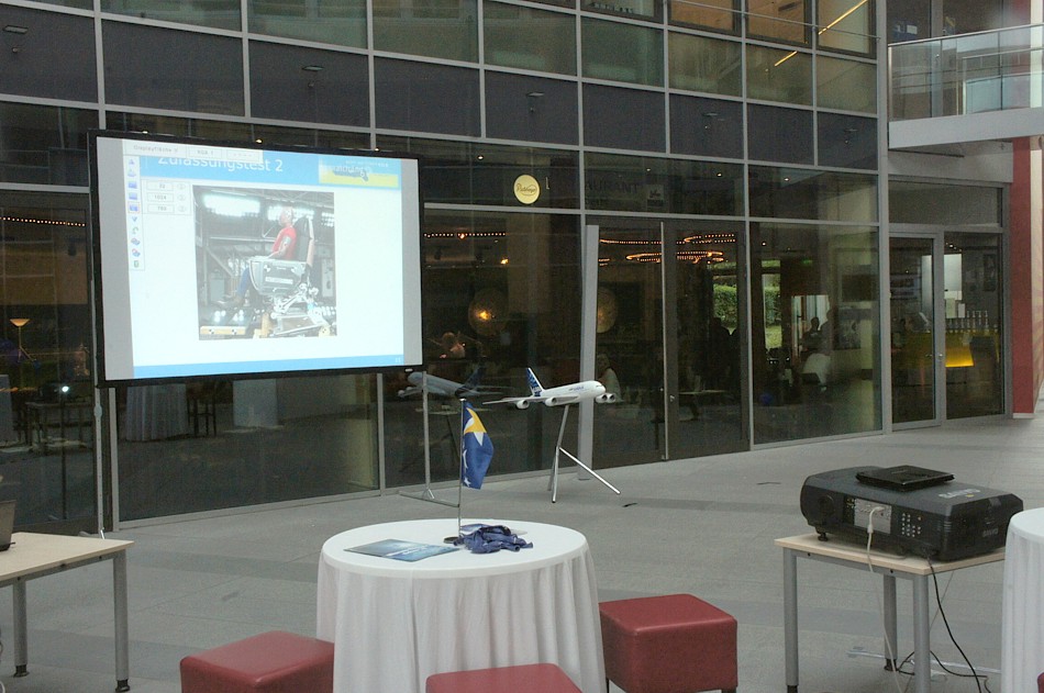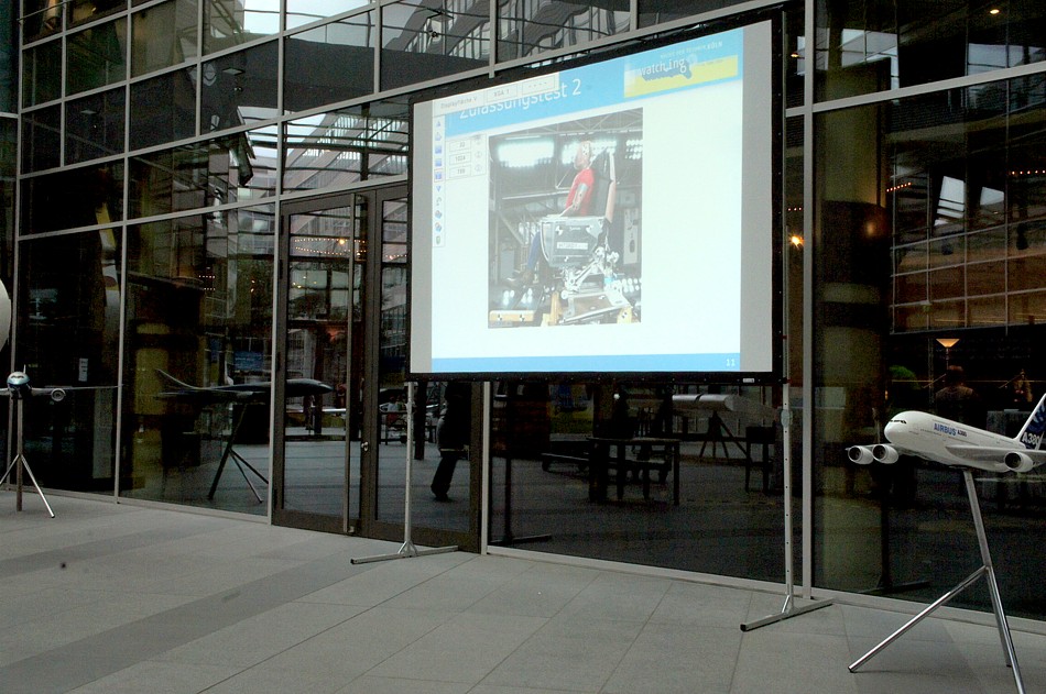 | Aufprojektionsfläche im Lieferumfang |  | Steckbares Aluprofil |  | Klappbarer Standfuß |  | von über 6. Zum Vergleich: konventionelle Rückprobildwandtücher weisen Gaingrade von ca. 1,8-2,5 Gain auf. Diese Spezialfolie kann daher bis zu über 200% heller als konventionelle Bildwandtücher sein |  | Rahmen höhenverstellbar |  | B1 klassifiziert nach DIN 4102 |  | EN klassifiziert nach EN 13501-1 B-s3, d0 |  | Druckknopfsystem |