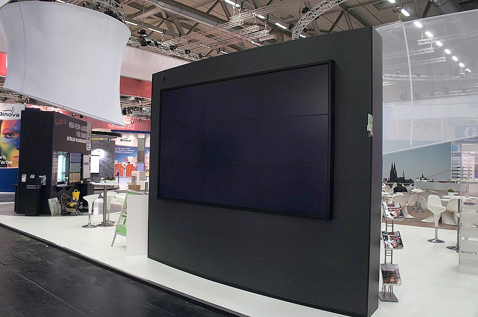 Aufbauzeit (Erfahrungswerte) für eine 9ner Steglos-Displaywand ca. 5-8 Stunden. Abbauzeit ca. 3 Stunden.