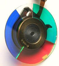 mit Hilfe eines Farbrades and die Leinwand projiziert (sequentielle Farbwiedergabe).