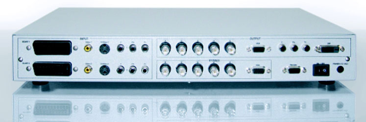 Damit wird allen gängigen Variationsmöglichkeiten von Ein- und Ausgabegeräten entsprochen und höchstmögliche Flexibilität garantiert. Die Kombination aller Eingänge mit den vier Ausgängen erlaubt auch besondere Formatkonvertierungen, wie z.B. YUV in RGB oder umgekehrt